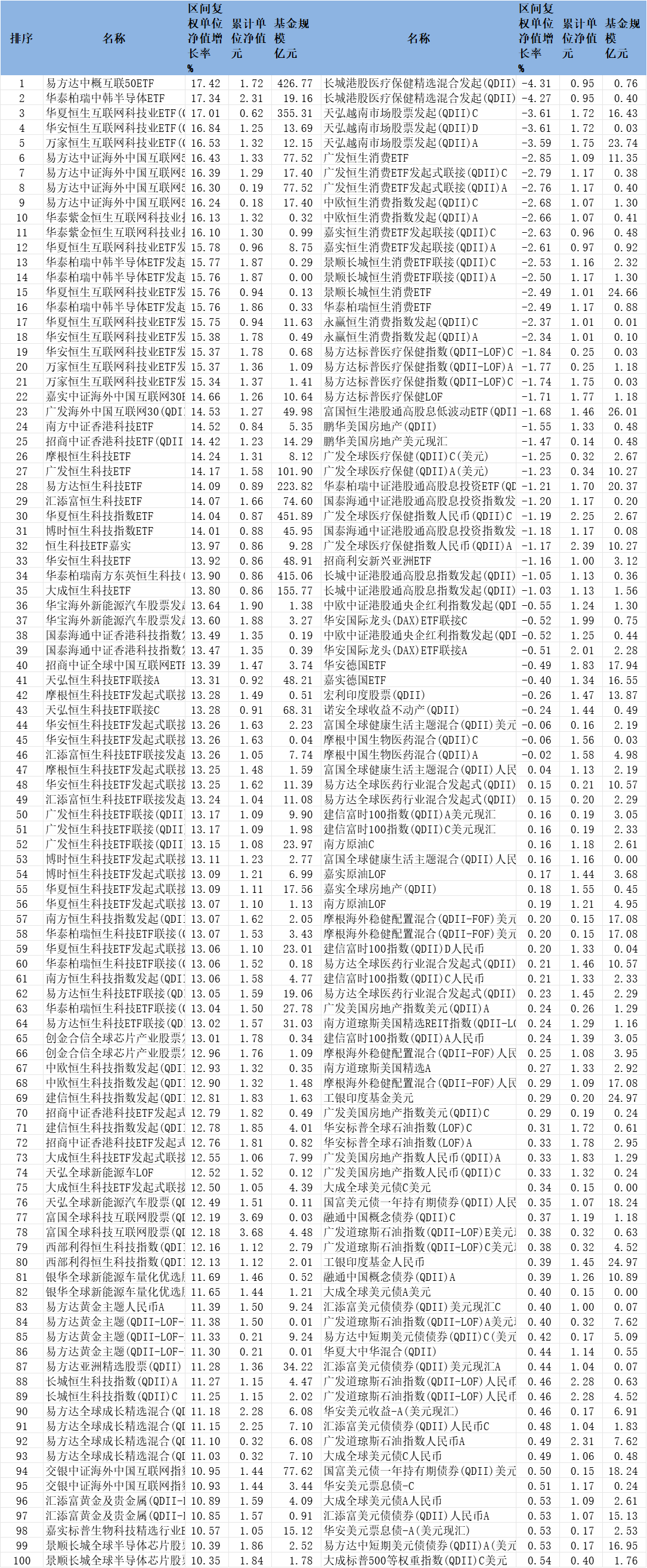 中国经济网北京10月13日电(记者何晓)今年9月,市场上业绩可比的680只QDII基金(各类股票单独计算,下同)中,634只基金净值上涨,占比93.24%; 46只基金净值下跌。 9月份共有11只QDII基金涨幅超过16%。其中,中国互联网50ETF基金以17.42%领涨。中国互联网50ETF基金成立于2017年1月4日,截至2025年9月30日,本年收益率为50.54%,成立以来收益率为74.38%,合计净值1.7438元。截至二季度末的资金规模为426.77亿元。今年上半年,该基金采取了投资组合复制的方式,并适当调整监测中证海外中国互联网50指数的另类方法。二季度末,排名前十的手柄分别为腾讯控股、阿里巴巴、小米集团、美团、帕里酷多、网易、京东集团、携程集团、百度集团、快手。在11只单月涨幅超过16%的QDII基金中,中国恒生互联网科技ETF(QDII)二季度末规模排名第二,为355.31亿元,9月份涨幅为17.01%。华夏恒生互联网科技ETF(QDII)成立于2021年1月26日,2025年10月9日,本年收益率为47.44%,成立时收益率为-38.65%,计入PI净值为0.6135元。该基金监控的标的指数为香港恒生互联网科技指数。今年上半年,该基金主要采用类似指数的投资方式。第二节结束前十名最大的账号是快手、网易、腾讯控股、京东、阿里巴巴、美团、百度集团、哔哩哔哩、金蝶国际和商汤科技。此外,华泰贝瑞中韩半导体ETF、环恒生互联网科技ETF(QDII)、先锋恒生互联网科技ETF(QDII)、易方达中证海外中国互联网50ETF链接(QDII)A(人民币股)、易方达中证海外中国互联网50ETF链接(QDII)中国互联网网50ETF链接(QDII)A (美元现货份额)和易方达中证海外中国互联网50 ETF Link(QDII)C(美元现货份额)截至二季度PA规模也超过10亿元。 9月份这些基金的收购比例分别为17.34%、16.84%、16.53%、16.43%、16.39%、16.30%、16.24%。华泰贝瑞中韩半导体ETF成立于2022年11月2日,2025年10月9日,本年收益率为67.94%,成立以来收益率为140.39%,净值合计净值为2。4039元。该基金监控CSI韩国交易所中韩半导体指数。上半年,日照平均偏差0.03%,日照监测误差0.04%,顺利实现投资目标。二季度末,基金前十名分别为SK海力士、三星电子、中芯国际、北方华创、海港信息、寒武纪、豪威集团、澜起科技、Gigadevice inNovation、Hanmisemiconductorco。标准普尔 500 医疗保健等权重指数和恒生消费者指数等产品。此外,部分监测恒生港股通高股息低波指数的QDII基金也没有表现。 2025年9月前100名QDII基金数据来源:同花顺(规模截止日期:2025年6月30日)