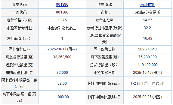 马可波罗控股股份有限公司 保荐机构(主承销商):招商证券股份有限公司 发行情况: 公司简介:公司以“打造中国陶瓷第一世界知名品牌”为使命,专注于建筑陶瓷的研发、生产和销售。是中国最大的建筑陶瓷生产和销售商之一,主要拥有“马可波罗陶瓷”和“维美L D陶瓷”两个自主品牌。截至招股说明书签署日,广东美盈实业投资有限公司(以下简称“美盈实业”)持有本公司69,215.85万股,占KapiTal发行前股份总数的64.36%,并对股东公司具有控制权。截至招股说明书发布日,黄建平持有公司股份 9,724,992 股直接持股比例为0.90%。黄建平持有美盈实业64.01%的股权和股东控制权,实际打压实业。美盈实业持有公司692,158,500股表决权股份,占公司表决权的64.36%。黄建平通过实业美盈直接控制公司64.36%的投票权。同时,美盈实业为嘉兴天威、嘉兴亿威、嘉兴智美、嘉兴汇美、嘉兴英美的普通合伙人(执行合伙人)。美盈工控是这些股东持有的公司的投票权;美丽控股是由嘉兴天威、嘉兴亿威、嘉兴英美投资设立的有限公司。实业并不通过控制嘉兴天威、嘉兴亿维、嘉兴映美来直接控制维美的处理。因此,黄建平通过控制实业,并不直接控制投票权。嘉兴天威、嘉兴亿威、嘉兴智美持有公司股份320,234,795股,占公司股权的29.78%。同时,与黄建平共事的谢跃增、邓建华分别直接持有该公司0.29%、0.21%的股份。合计而言,黄建平直接和间接持有公司股份合计为42.12%,其控制的股份投票权为95.55%。其为本公司实际控制人。 2022年1月,黄建平、谢跃增、邓建华签署了《一体化行动协议》,约定三人就与授予人股东份额相关的事项进行表决时,意见不一致的为表决意见。如未达成一致意见,黄建平的意见为同一意见。因此,谢跃增、邓建华与黄建平一起演戏。马可波罗首次公开发行股票招股说明书及在主板上市2025年9月25日披露的主板显示,公司拟募集资金237,656.26万元用于江西嘉美陶瓷股份有限公司智能陶瓷家居产业园(一期)建设项目、江西嘉美陶瓷股份有限公司升级改造项目、广东嘉美陶瓷股份有限公司绿色智能制造升级 及改造项目、江西阿唐美陶瓷有限公司建陶生产线绿色智能制造升级项目、马可波罗控股有限公司综合能力提升项目。 2025年10月10日披露的公开马可波罗首次发行股票及主板挂牌情况显示,发行价格为13.75元/股,新股发行数量为11,949.2万股,若本次发行成功,公司预计新增资金总额为164,301.5万股。减少发布费8302.12万元(不含税广告)后预计募集资金净额为155,999.38万元。